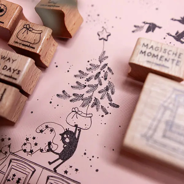 Cats on appletrees produziert liebevoll illustrierte Motivstempel. Klassisch auf Holz montierte Stempel erzählen kleine Geschichten rund um Friedegunde, die Katze, und eine findige Hundemeute, die reichlich Unruhe in das beschauliche Katzenleben bringt. Die Motive sind so designed, dass sie sich untereinander kombinieren lassen und immer neue Varianten ergeben.