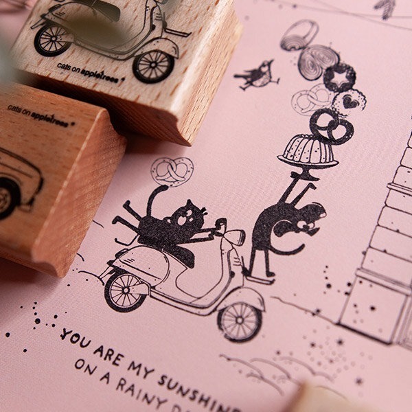Cats on appletrees produziert liebevoll illustrierte Motivstempel. Klassisch auf Holz montierte Stempel erzählen kleine Geschichten rund um Friedegunde, die Katze, und eine findige Hundemeute, die reichlich Unruhe in das beschauliche Katzenleben bringt. Die Motive sind so designed, dass sie sich untereinander kombinieren lassen und immer neue Varianten ergeben.