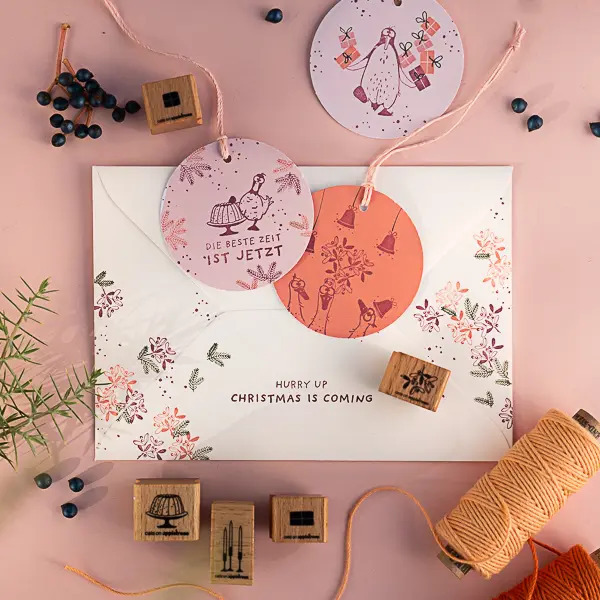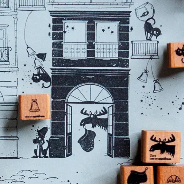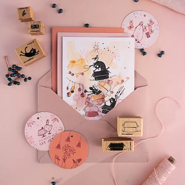 Cats on appletrees produziert liebevoll illustrierte Motivstempel. Klassisch auf Holz montierte Stempel erzählen kleine Geschichten rund um Friedegunde, die Katze, und eine findige Hundemeute, die reichlich Unruhe in das beschauliche Katzenleben bringt. Die Motive sind so designed, dass sie sich untereinander kombinieren lassen und immer neue Varianten ergeben.