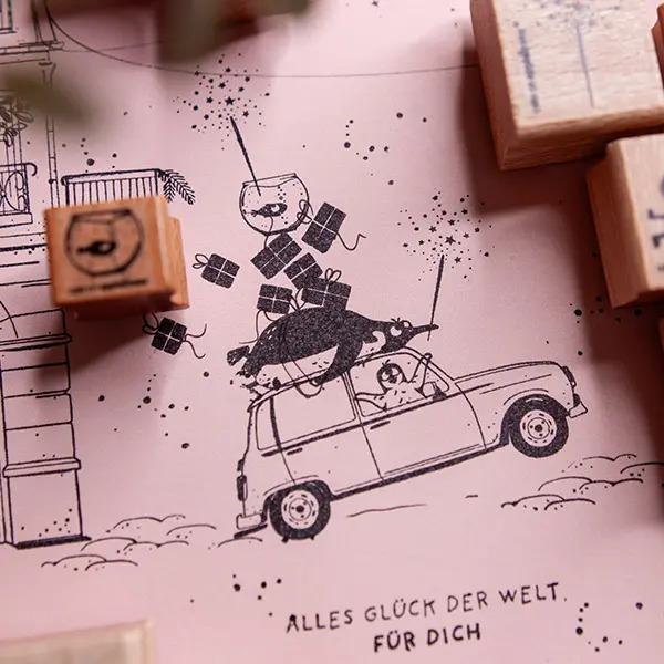 Cats on appletrees produziert liebevoll illustrierte Motivstempel. Klassisch auf Holz montierte Stempel erzählen kleine Geschichten rund um Friedegunde, die Katze, und eine findige Hundemeute, die reichlich Unruhe in das beschauliche Katzenleben bringt. Die Motive sind so designed, dass sie sich untereinander kombinieren lassen und immer neue Varianten ergeben.