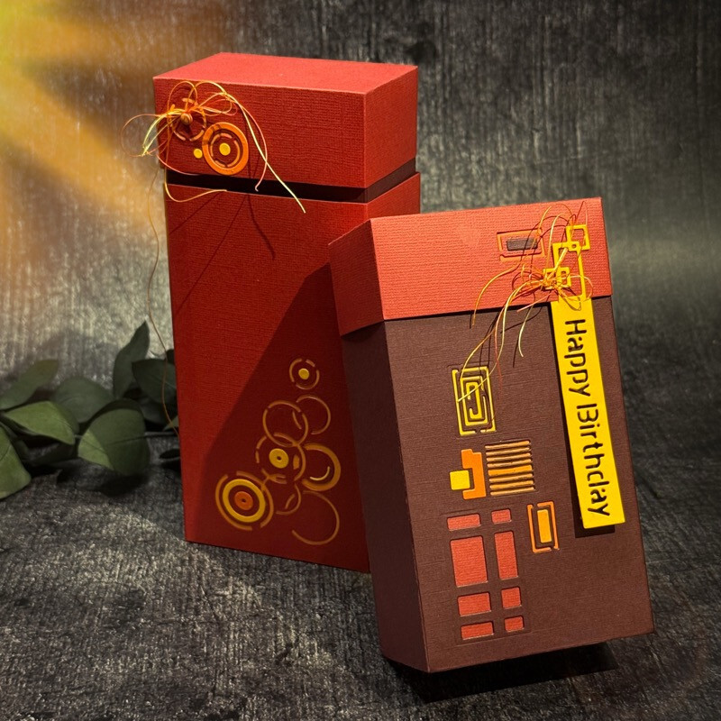 Eine rechteckige Schiebe-Box bestehend aus 2 fast gleichgroßen Boxen, die genau ineinander geschoben werden können. Die eingestanzten Dekore in der Außenbox lassen die eingeschobene Innenbox farblich leuchten.