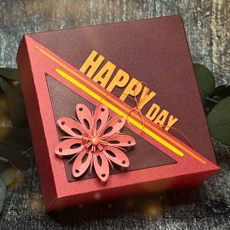 Die Schachtel besteht aus einer quadratischen Box, die durch eine Dreieckshülle verschlossen wird. Box und Hülle werden mit einem Streifen verbunden, der damit einen tollen Klappmechanismus auslöst.