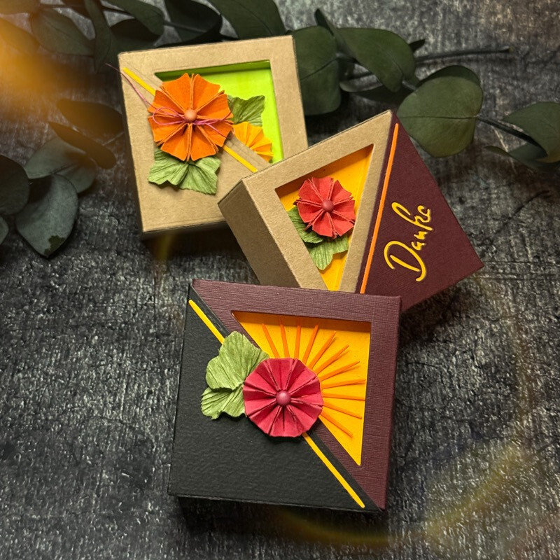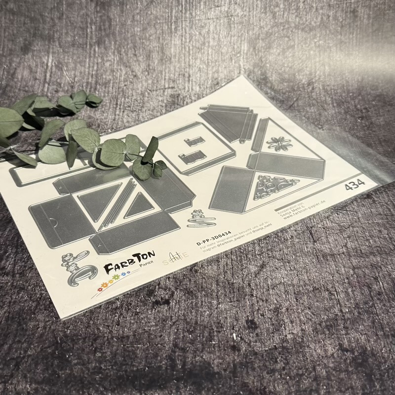 Die Schachtel besteht aus einer quadratischen Box, die durch eine Dreieckshülle verschlossen wird. Box und Hülle werden mit einem Streifen verbunden, der damit einen tollen Klappmechanismus auslöst.