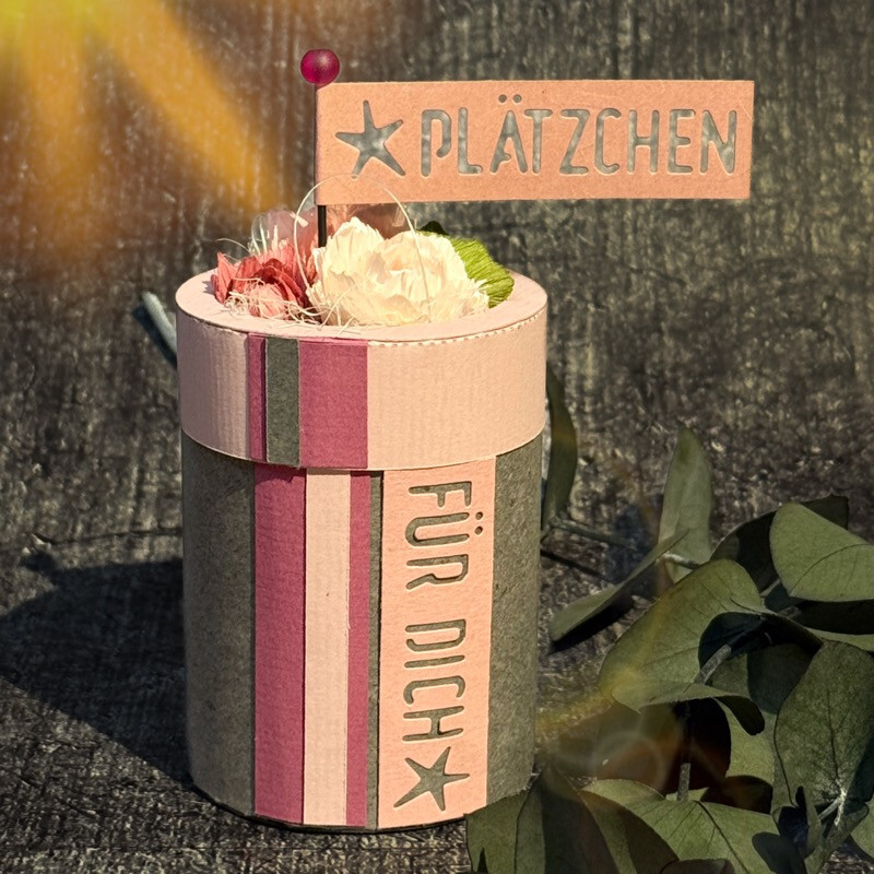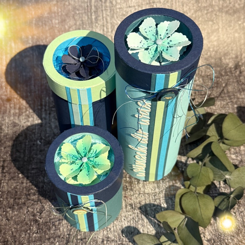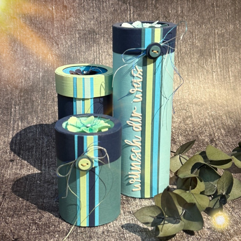 Runde Boxen mit eingebautem Fenster, bei denen der Durchmesser festgelegt ist, ihr aber die Höhe selbst bestimmen könnt. So habt ihr mit einer Stanze ganz verschiedene Boxen.