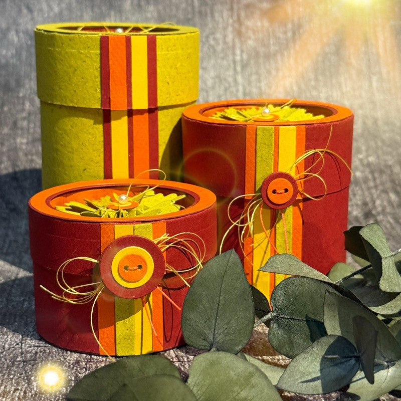 Runde Boxen mit eingebautem Fenster, bei denen der Durchmesser festgelegt ist, ihr aber die Höhe selbst bestimmen könnt. So habt ihr mit einer Stanze ganz verschiedene Boxen.