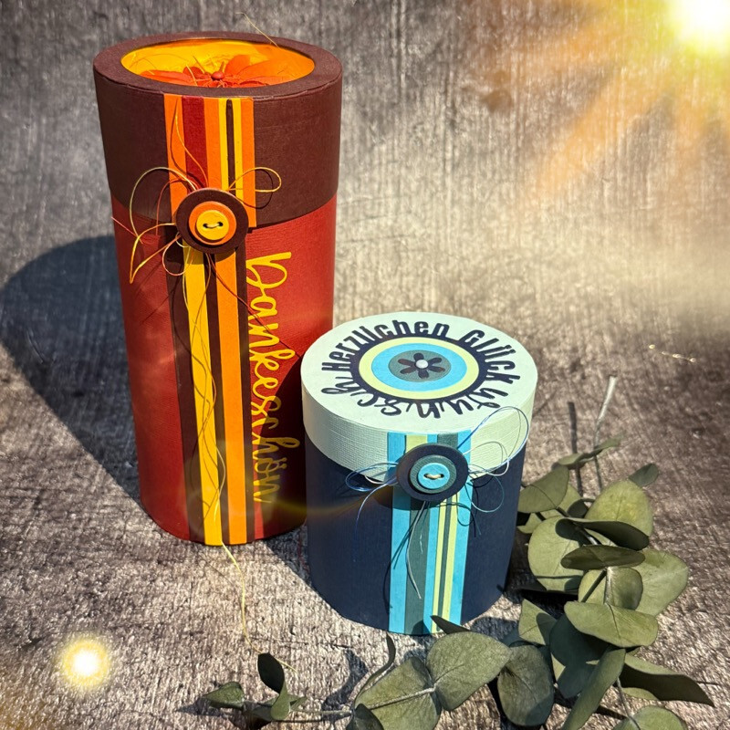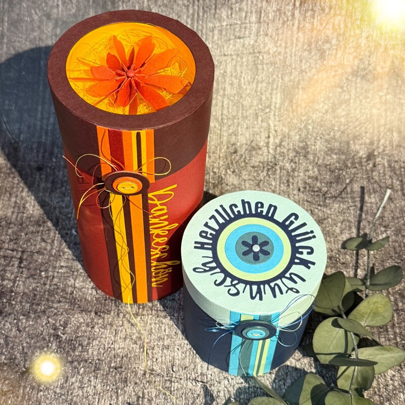 Runde Boxen mit eingebautem Fenster, bei denen der Durchmesser festgelegt ist, ihr aber die Höhe selbst bestimmen könnt. So habt ihr mit einer Stanze ganz verschiedene Boxen.