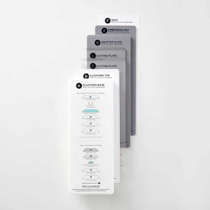 Im Starterpaket sind alle Platten, Schneideplatten und unterstützende Bögen enthalten, die man zum Stanzen und Prägen von verschiedenen Stanzformen und Prägeplatten benötigt.
