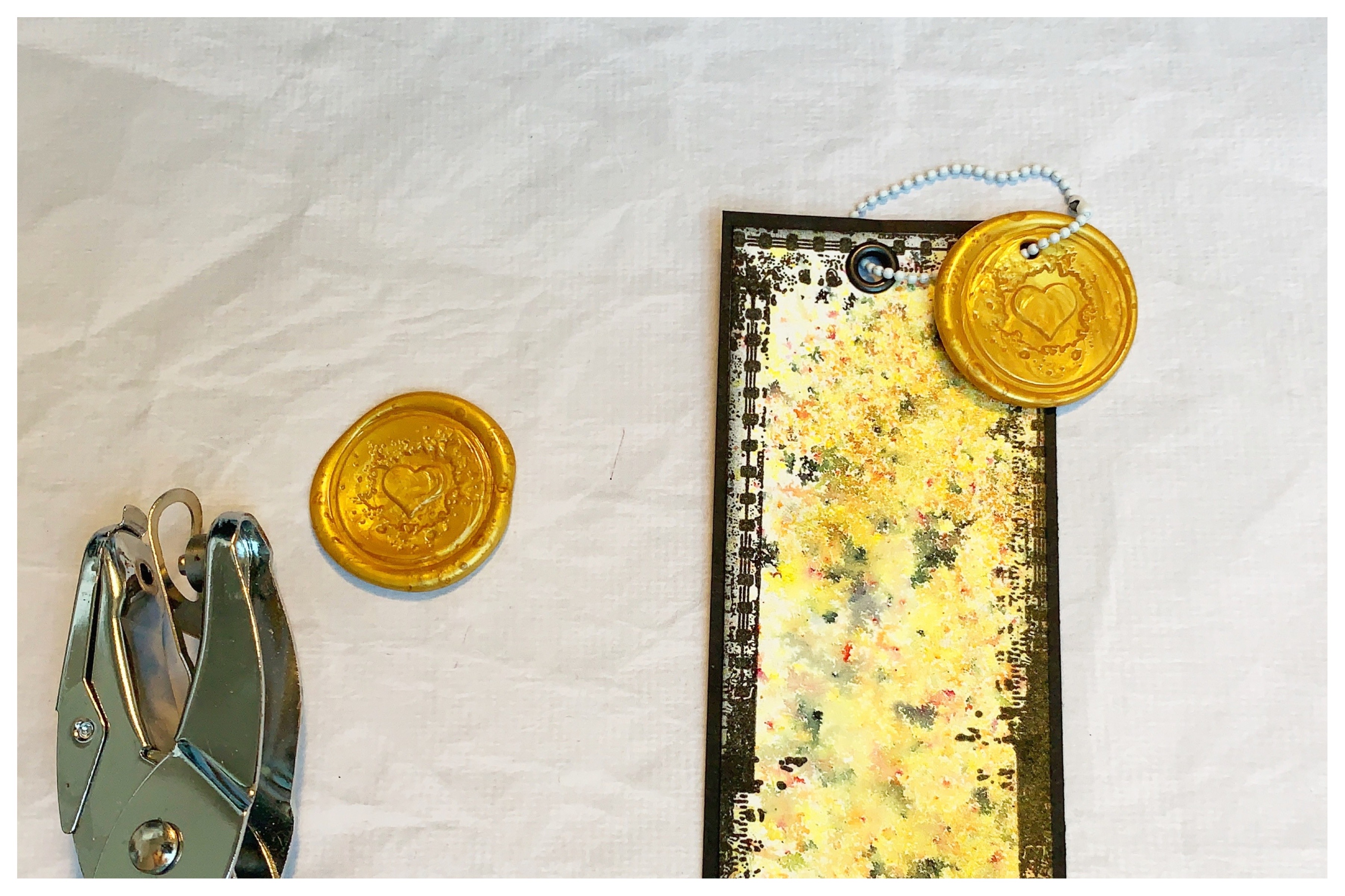 Siegel lassen sich auch lochen und als Anhänger verwenden, für Geschenkanhänger, Mixed Media und Junk Journaling. Dazu die Wachssiegel gießen und nach dem Erkalten nicht zu nahe am Rand lochen. Danach ein Band, Schnur oder Gliederkette anhängen.
