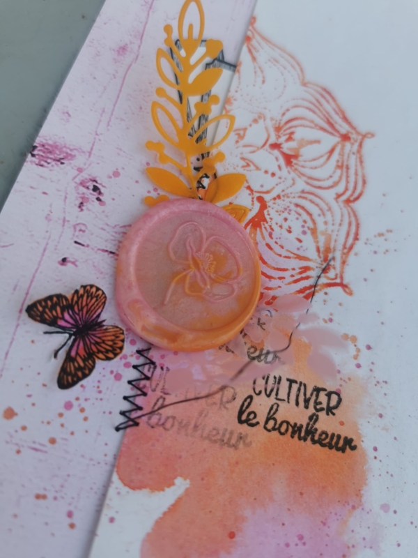 Du kannst Embellishments, Stanzteile, getrocknete Blumen, Blätter oder Grashalme auf deinen Projekten mit Wachssiegel fixieren. - Verzieren:
